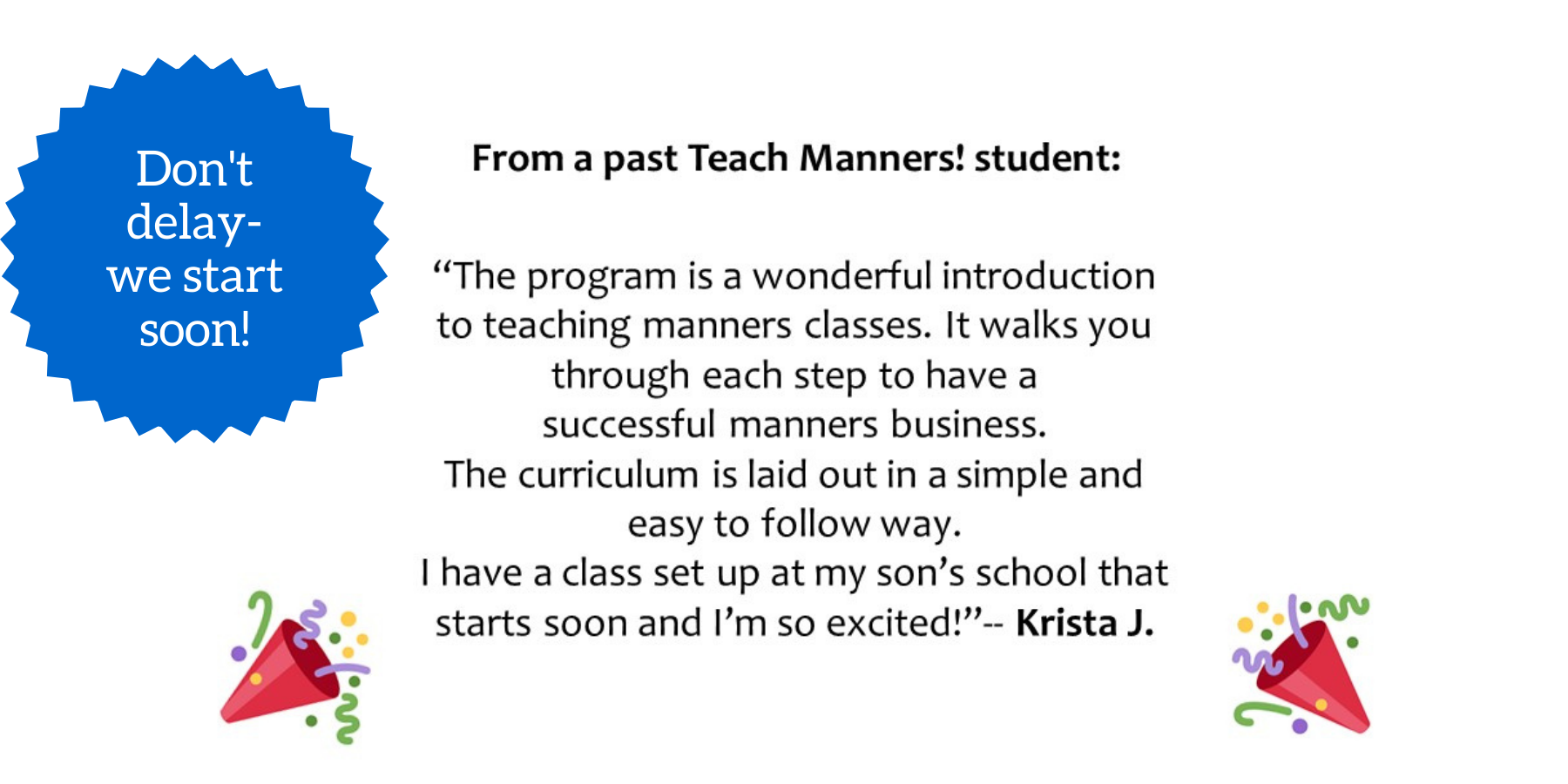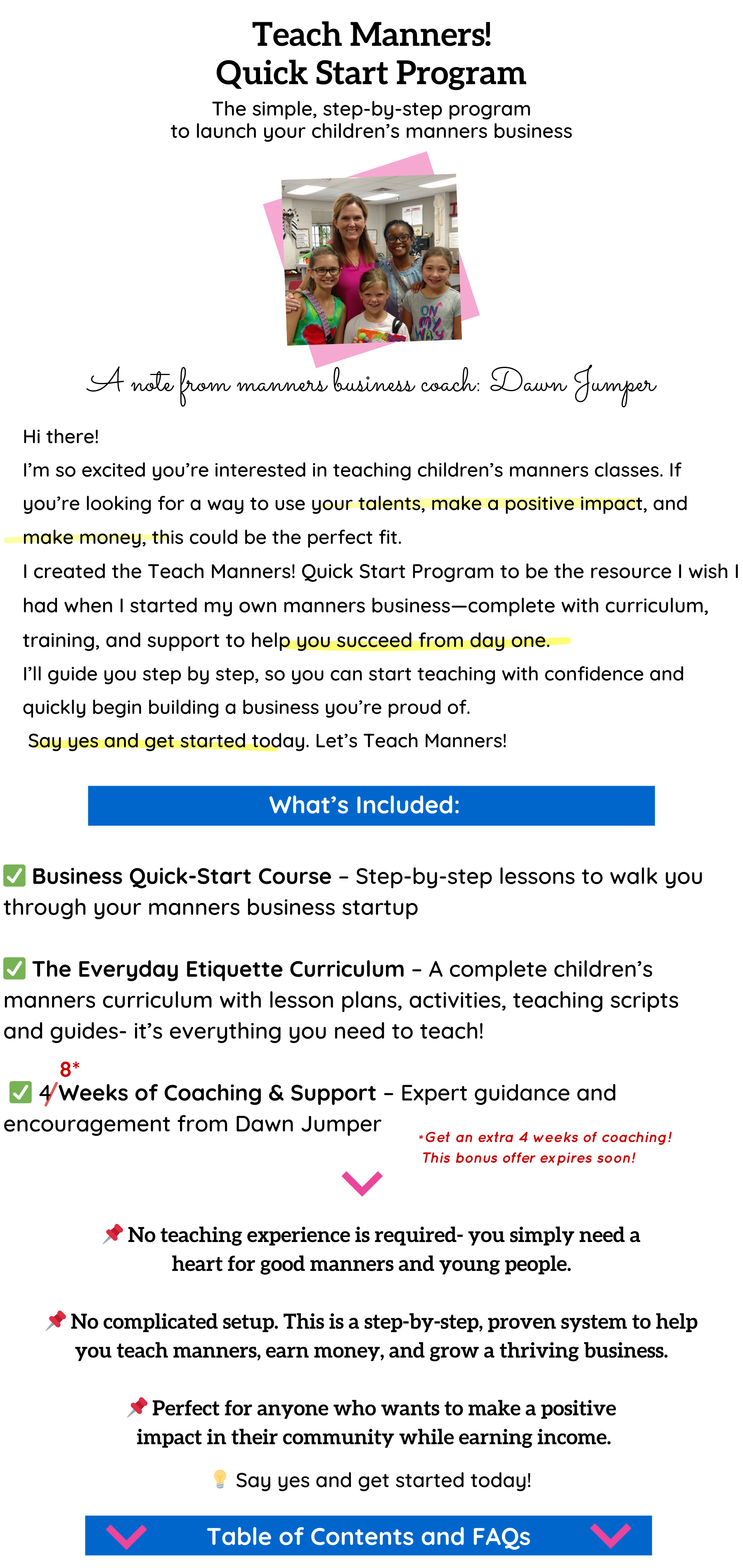 You decide how much you earn because you own your manners teaching business- you are the boss! Your earnings will align with your effort and how much you choose to work in your business. You will set your pricing and payment policies. In The Teach Manners! Quick Start Course, I share my best advice and practices on setting your pricing, how to get paid, how to set your teaching calendar, etc. I'm happy to share more specifics about my pricing and profits in a discovery call.